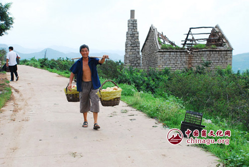 卢崮位于岱崮镇驻地西北4.6公里处。此去不远,沿途多见崮乡农人采摘蜜桃,红彤彤又大又圆,令人垂涎;或见果农聚集村头巷尾候车、叫卖。收获的喜悦现于言表。车行历燕窝、台头、卢崮沟、茶局峪等村,转眼就到卢崮。前面由于没有公路,无法通车,我们只好弃车步行上山。