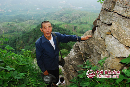 起初,我们计划从山东南坡攀爬。但见卢崮主峰由南至北,山岩陡峭,高不可攀。遂北去,至东西走向山梁。在卢崮主峰东侧,与另一处攀爬而至的崮乡诗人徐老先生汇合。徐老先生者,徐志本老人也。年已七十有四,身板硬朗,翻山越岭,如履平地。