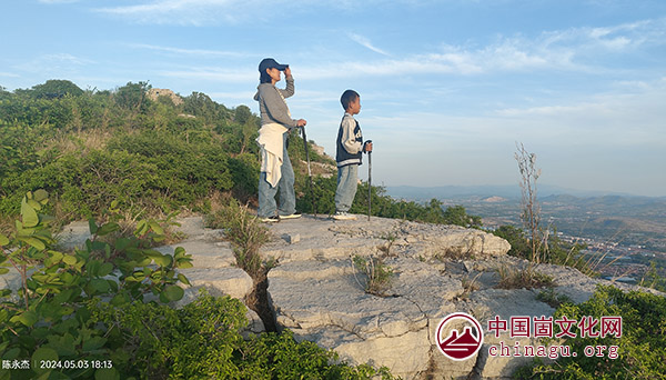 在高德地图中搜索“太平崮”,5月3日下午3点半,按照导航提示,将车停在了导航路线的尽头。下车后抬头一看,我们位于一座高崮南侧的一处山坳中,三人爬上山梁,来到一条环山土路上,高崮悬崖绝壁,巍峨逼人,不见登顶之路,只好沿着土路往东走,寻找登顶之处。转到东侧一处名叫凤凰岭(又称金鸡峰)的山梁上,依稀可见有人走过的迹象,就沿山脊登顶。没想到这座崮下的小山头,竟然岩石陡峭,攀登困难。7岁的儿子玮似初生牛犊,一路在前,灵巧的像一只猴子,遇到陡峭的地方,没等我伸手去托,就顺利的上去了,还大声喊:“爸,妈,快点!”攀上凤凰岭,走过狭长、平坦的顶部,来到太平崮悬崖底部,东北方向有相邻两山头,顶部一呈锯齿状,一呈砧子状,故分别称之为锯齿山、砧子山。
