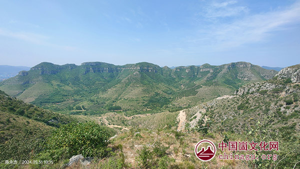 目前位置是太平崮东南的尖角处,崖壁直立,无路可上。沿崖底南侧绕到崮西侧,西面又是一座大崮,两座崮体相连的地方,有小路分别通向两侧崮顶。来到东侧崮顶,发现崮顶面积较大,地势自西南向东北略微倾斜,除了西部有一段石砌围墙及一座岗哨类遗迹外,未见古建筑影子。观察四周崮群,回来后又查阅资料,才发现因事前功课未做到位,攀错了山头:这是南太平崮,古建群不在这儿,而是在北面的北太平崮上!原来临朐太平崮有南、北两峰,主峰相距约1.5公里,古建筑群在北太平崮上,属城关街道,南太平崮又称点将台,属五井镇。