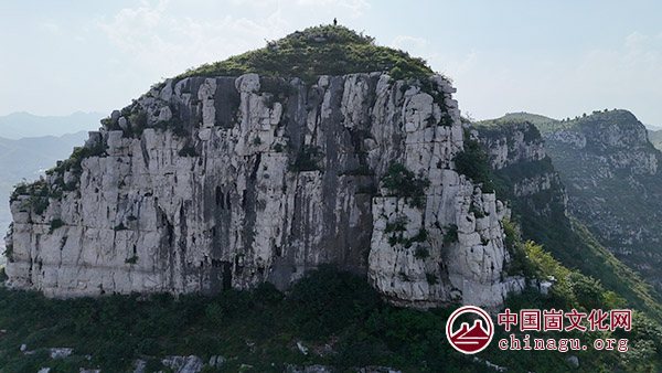 明光峰西为纱帽峰。纱帽峰又称“火炉子山”,因山阴有峻峭山峰,如皇冠的顶戴花翎,故又称“花翎峰”。纱帽峰是诸峰中比较挺拔秀气的一座,三层崮体层层缩进,四周崖壁如削,崮顶平坦,面积不大,有东大西小两个圆形山寨文化遗迹,大的寨墙分上下两层,层距约2米,内层墙厚0.8米,残高0.4米。墙基及西侧岩石之上有大小23个石砌石人,石人高在0.4米至2.2米之间,似好事者为玩耍而堆砌。关于纱帽峰,《花园河村志》(方志出版社,2019)如此记载:“纱帽峰又称‘皇冠崮’‘帝王崮’‘判官山’,位处八岐山脉西北部,由油瓶崮、金龟崮和金蟾崮组成。中间为主崮金龟崮,山崮酷似昂头巨龟而得名。左侧金蟾崮酷似蟾蜍。金蟾含玉,寓意招财聚宝。右侧油瓶崮,如油瓶状,象征富足流油。油瓶崮、金龟崮、金蟾崮连起,中崮翘,两侧崮体浑圆,恰似皇冠。纱帽峰前有花园河,流水潺潺;南有八峰如森戟排列,似出征的八大将军,为坚固的天然堡垒;北有马连山、太平崮等,崮顶平坦如砥,土地肥沃,当地村民多称马场、擂鼓台、点将台。”位列八岐山八峰之一的纱帽峰,怎么看也看不出三崮并列的样子,仔细查看该志第85页所附的“纱帽峰”照片,再和我所拍摄的照片对比,原来是该志把八岐山脉西山中的文状山错为“纱帽峰”了!也就是说,该志第85页介绍的“纱帽峰”实际是西面的文状山,所附照片应为“文状山”,而非“纱帽峰”。文状山位于阁老崮北侧,是八岐山脉西山群峰中的一峰,该山石层如书卷,一层一层似扒皮,故又称扒皮山、剥皮山;三崮连起,中崮微翘,左右两崮浑圆,恰似皇冠,故又有皇冠崮、帝王崮、判官山等称呼。山有三峰,按其形状分别称为油瓶崮(又称油瓶山)、金龟崮和金蟾崮(又称金蟾山)。