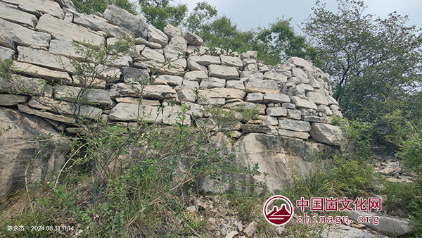 沿山脊北行,经过一组巨石,迂折至崮东南侧坳处,很远就望见寨墙上似有一豁口,以为是寨门,到了跟前,发现并不是。我观察了一下,寨墙之下崖壁上岩面凹凸不平,可借助手抓脚蹬,寨墙之上南侧有坍塌,可从此上钻至崮顶。我先尝试了一下,成功登顶,老田夫妻随即效仿,也成功登顶!上到崮顶,发现所在位置是崮顶最东端的一处哨所类建筑。