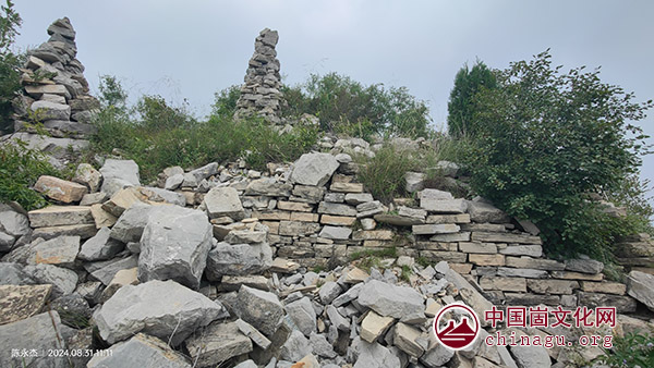 郭老崮山寨建于清末民初,郭老崮战斗后,山寨部分遗址残存。围墙周长70余米、高3米、宽2米左右。寨内有石屋数间,最大者20余平方米。崮顶东南、西南各有一条小路,入口处均有石屋,可能为岗哨,每间七八平方米。《临朐村镇志略·五井卷》说崮顶面积约1.2平方公里,我觉得面积没有这么大。在崮顶转悠时,发现在围墙及岩石上有大小不一的10个石人堆,高约1-3米,直径平均1米左右。起初不知此为何用,后来读到网友的一篇介绍文字,说他去时只有3个石堆,并认为这是玛尼堆,属于藏传佛教的一种风俗。当时最高的一个石堆上有一个大“莲花”,内置太阳能读经机,一遍遍重复播放着“南无阿弥陀佛”,证实其确为佛教风俗。崮顶少高大植被,玛尼堆之间、寨墙内外,长有低矮的酸枣、黄栌、椿树、黄荆、大果榆等林灌,及野韭、山芹、柴胡之类。