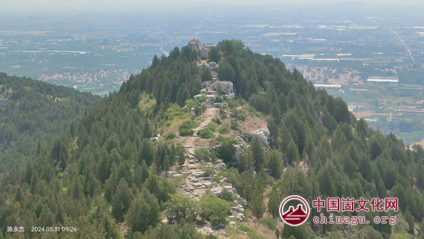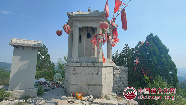 沿着村南两侧栽有老柿、山楂等树的环山水泥路盘旋而上,水泥路尽头是北侧山梁,上有明显登山小径,穿过松林,来到梁脊,有一座水泥圆柱6柱6角景观亭,《临朐揽胜》一书中说沿北太平崮“东北峰攀援而上,至其巅三分之一处,有山神庙,今已废”,估计原山神庙应在亭子附近。亭内摆有关羽、观音、送子娘娘、山神等塑像,亭前及路侧松树枝桠间压有石块,应属压石求子习俗。沿松林间长长的青石台阶(天梯)朝南上行,不久即到“点将台”,相传此为商侯逄伯陵讨伐叛将杨骥的点将布阵之所。