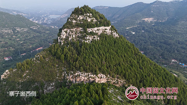 崮顶遍植青松,面积不大,但较平坦,呈东西走向,东面有一个稍低些的平台,村民称为寨子崮东山。崮顶东部有2座相距不远的类似玛尼堆状的石房子,圆形尖顶,各开一门,一南向一东向,里面有低矮石座。崮顶四周有围墙,未见其他房屋及寨门类遗迹。