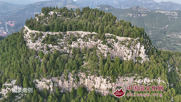 我俩所在的位置,和东面峡谷最高点基本处于同一水平线上。东望寨子崮,只见崮体浑圆似帽,中部一圈围墙,再上一圈岩石,崮体的底部、中部和顶端是翠绿的青松,白绿相间。从这个角度看,一峰圆秀凸起,三面峭临深谷,俨然如天柱,寨子崮的另一个名字“天柱峰”,还是很贴切的。