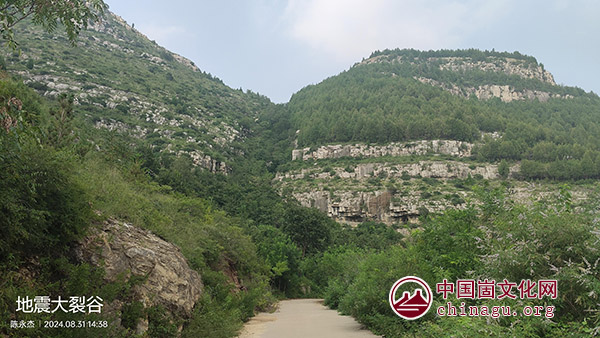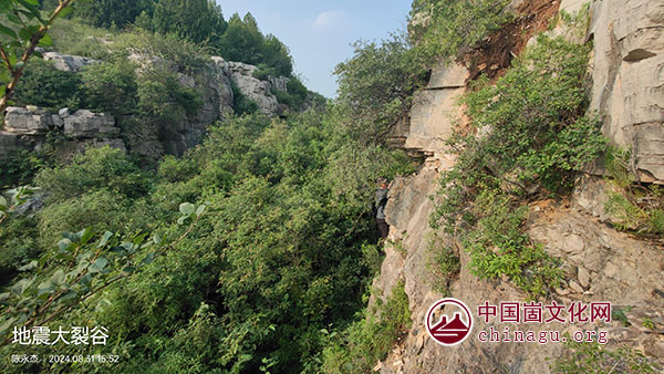 来到峡谷西侧,我俩伸头一看,傻眼了:没想到这条峡谷这么深这么宽!峡谷宽有八米,深不可测。关于这条峡谷,有这么一个传说,相传后周柴三爷(五代第一明君柴荣)推车压脉头,车过寨子崮时压上一条沟,险裂百丈、凹通南北,名曰“车辙子溜”或“车子沟”,两侧壁立如削,奇石耸立,飞松倒挂,险峻奇绝,另外还留下了五指河、三块石头、灰泉子、故渣岭等象征性自然形象。经考察考证,这条北到石门山,南到灰泉八岐山的断裂长线,并不是车压的,而是亿万年前寨子崮地震大断层遗迹,至今地震局仍不断前来考察这条大断层。