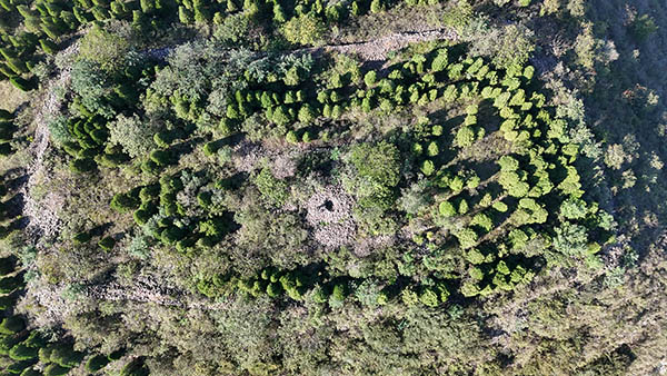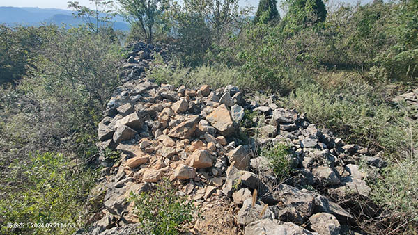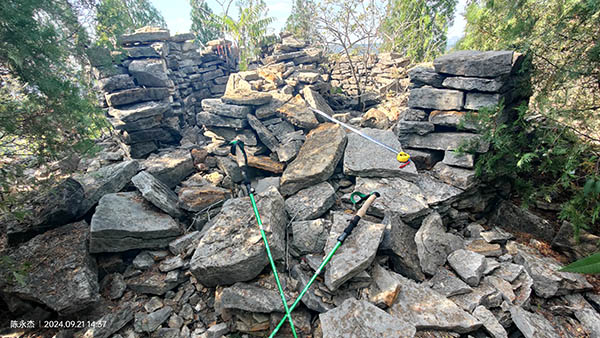 过了岗哨,到达山顶,有规模较大的山寨文化遗迹。围墙属双层复墙,宽2米,残高2-4米,围墙上有岗哨类遗迹。进入围子内,远远就望见中部位置有一个大石堆,近前仔细观察,发现这又是一个圆形岗堡,内径2.3米,外径4米,从中部堆积的石块数量看,当时围墙应该很高。正中间有刚刚清理过的人为痕迹,挖出一个类似陨石砸出的圆形深坑,不知是为了研究建筑,还是在找什么。围墙内有少量石屋遗迹,已坍塌殆尽,几乎没有屋墙遗存。从高空俯瞰,整个围子依山势呈南北向长方形,中部制高点是一圆形主建筑,四周散落着房屋,围子北面不远处是一座圆形岗哨。