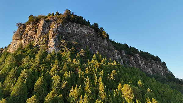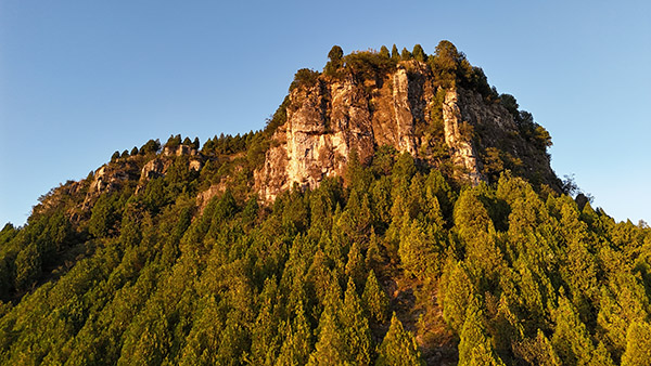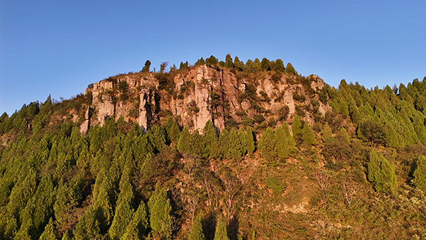 娘娘顶东、西、南三面悬崖,顶部平坦,东北是缓坡,与鹰咀崮相连,具有明显的崮貌特征,确实是一座典型的崮。崮顶植被多为松柏、刺槐,杂有部分黄荆、酸枣、山榆等。站在崮顶向东俯瞰,只见有几座小山头,也呈明显的崮貌特征,只是海拔不高,面积也小,这几个小崮,好像是几个崮宝宝,显得乖巧可爱。