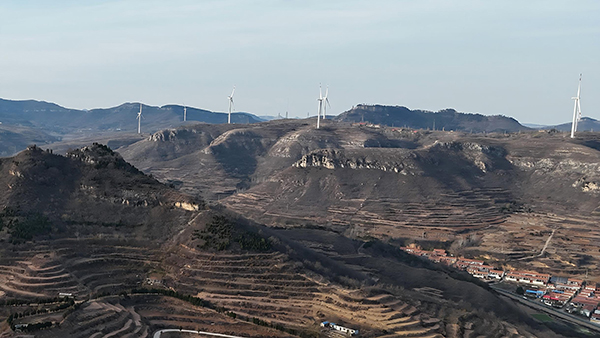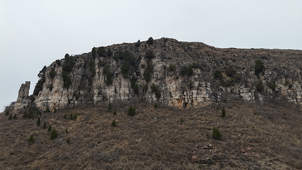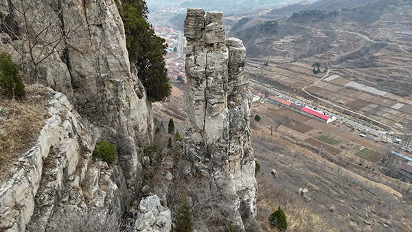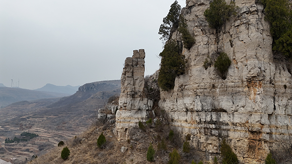 我问如果上去看看石柱子,路好走吧?他说路不是很好走,但能上,前些年有很多人来看石柱子,这段时间没人来了。看看山很陡,但上下光秃秃的,山势一目了然,不用瞎猜路。我决定先看看石柱子,再去禅堂崮。山坡又陡又滑,没有绿化,稍一抬脚,砂石咕噜噜下滚。十几米高的悬崖西端,距离崖壁一米多远处,耸立一根石柱,三四人合抱粗、五六米高,顶部岩石风化开裂,又分为四根短柱,状如人头,远望如高矮不同的四人簇拥在一起,面壁而立。如面朝外侧,完全可以命名为望海石或望夫石之类,而今却是面朝近乎直立的崖壁,可是在面壁思过吗?石柱子所在的山头,和东西两侧的山头连麓,形成一座巨大的不规则崮体,崮下斜坡及崮顶除了荒草和几架高大的风力发电装置外,没有高大植被,反而不如陡峭的悬崖绿化率高,崖壁石隙间,竟然挂有不少崖柏和其他灌丛,这些倔强的林灌,为单调的悬崖涂抹上了生命的色彩。
