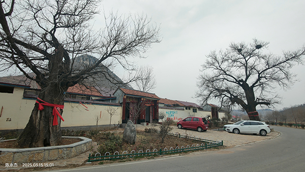 看完石柱子,上车继续沿河西行,至石柱子正南侧的小时家庄村西拐弯处,被两棵粗大的古槐吸引,再次停车。古树名木、珍稀大树也一直是自己喜欢的研究课题之一,作为生命延续至今的植物,它是历史的物质遗存,其中包含着重要的历史文化信息和环境变迁信息。它那精巧、生动的年轮结构,就像一面历史的明镜,给人们展示着它所经历的那些漫长岁月的气候、水文、地质、地理、生物、生态等变化情况。古树名木是“活的文物”“绿色古董”,所以我们每一个人都有责任去爱护珍惜这些珍贵的古树名木。近二十年来,专程或顺道实地查看了不少古树名木,2012年曾整理过一篇关于沂水县古树名木种类及其分布、保护的文字,至今看来,仍有意义。
