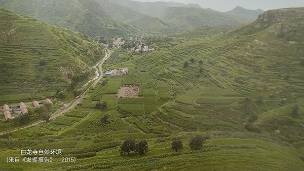 文保碑没有提到寺院的名字,为了进一步了解该寺院情况,特地上孔夫子旧书网购买了一本《临朐白龙寺遗址发掘报告》(山东省文物考古研究所等编,文物出版社,2015)。细阅发掘报告,又了解到以下情况。佛寺遗址海拔258米,位处开阔的山谷中,四周环山,南侧开阔,相对隐蔽,南临小河,冬暖夏凉,周围土地肥沃。从地理位置、自然环境来看,是佛家建立佛教寺院的良好地点。遗址在发掘之初,定名为“白龙寺遗址”。据明嘉靖三十一年(1552年)《嘉靖临朐县志》载“县南65里有白龙寺一座”,清康熙十一年(1672年)《康熙临朐县志》载“白龙寺,即十字院,在常庄社,至县60里”。县志中记载的地理位置和小时家庄佛教建筑遗址位置相近,且遗址周围百姓非常信仰白龙,在遗址北禅堂崮一带有“白龙神庙”的刻铭,东北方的白龙洞亦有白龙神庙的建筑基址残碑断碣,有一保存完整的皇帝赦建白龙神庙的御碑,附近还有仙姑庙、泰山行宫遗址及碑刻等佛教遗存。因此在发掘之初,将遗址定名为“白龙寺遗址”。但在遗址实际发掘过程中,没有发现相关的文字证据,依照考古学遗址常规命名的方法,应该命名为“小时家庄佛寺建筑遗址”,但考虑到在发掘之前及发掘过程中已经使用,《发掘报告》中仍然沿用了“白龙寺遗址”的名称。