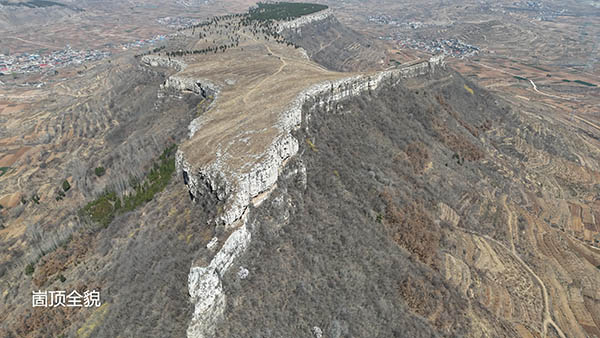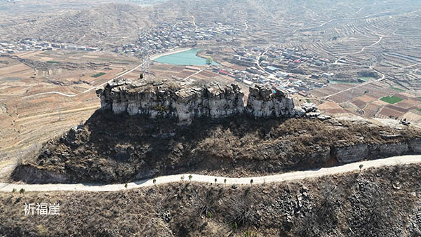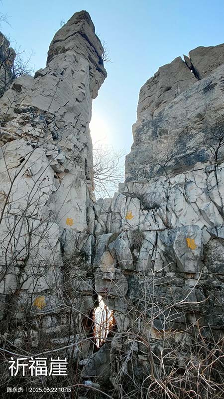 瞻仰完纪念馆,沿两峰山坳间曲折小路上山,直至水泥路尽头停车,已在崮顶了。既然已在崮顶,也就用不上背包、登山杖等装备了,这是为数不多的可不用户外装备的高崮之一。停好车后,决定按照顺时针方向在崮顶绕行一圈。南北向长长的崮体,南部向东延伸一脊,尽东头一峰独耸,高约20米,薄如刀片,两组巨石中间部位有五六米上下开裂的缝隙,隙底有一个小小的椭圆形透明洞,北侧崖壁有黄漆涂写的十几个“福”字,最西侧崖壁上涂有“福”“健康”“平安”等字,以前在网上多次刷到网友在此处的留影,已成网红打卡点。这处独立的山头,实际上也是一座小崮,不知道名字,姑且称之为“祈福崖”吧。祈福崖往西连接崮体的山梁上有平台,有五位年轻人冒着大风在此聚餐,他们是骑五辆悬挂江西牌照的摩托车上来的。