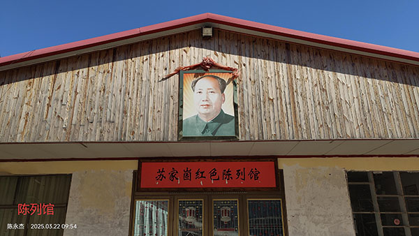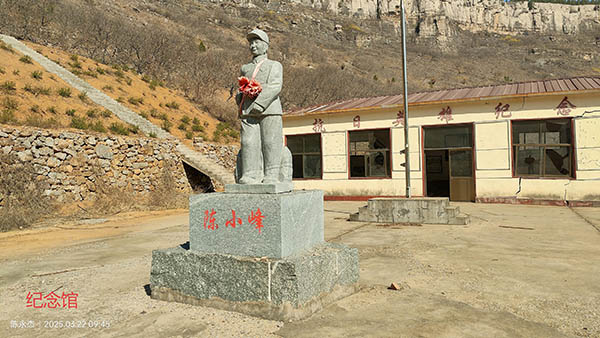 等车队通过后,我驾车上山。沿着一车道多宽的水泥路,来到山腰处的抗日英雄纪念馆和红色陈列馆,纪念馆前广场中央立有陈小峰塑像(苏家崮抗日烈士纪念碑碑文及多篇参加过战斗的当事人的回忆文章作“陈晓峰”)。纪念馆和陈列馆内部都是破败不堪,看样子已经废弃很久了。
