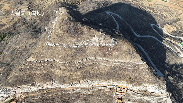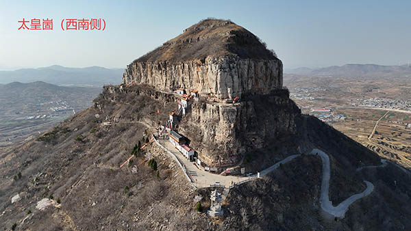 巍然矗立的太皇崮,从不同的角度远望形态各异。东面远望如一擎天柱,南面和北面远望如一长方形的巨大镜面,又如一堵巨墙;西南面远望则如一只振翅欲飞的巨鹰。崮体从底部向上层层缩进,共有五层崮台,状如五重台阁,高出云表,三面陡壁如削。第一层东部路面已硬化,可开车从东侧直达平台,这一层平台上有景区管理办公室、小商店、重修碑刻、景观亭、卫生间等设施。第二层平台为主景区,有云台寺遗址,经多年人工修整,有挂壁小径可绕崮一周,称“天街”。第三、四、五层难以登顶,最顶层平面呈三角形,中部略有凸起,有一圆形浅坑及一大石臼等遗迹。