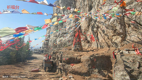 第二层平台为主景区,钻出方便门,迎面是大雄宝殿,两侧红字对联为:古寺云台千年久,佛光普照万民安。大雄宝殿东西两侧分别为观音殿、地藏殿,绕崮一周为天街。沿天街西行,过地藏殿有祈福台,台中有石砌玛尼堆,辐辏状彩带迎风飘扬。