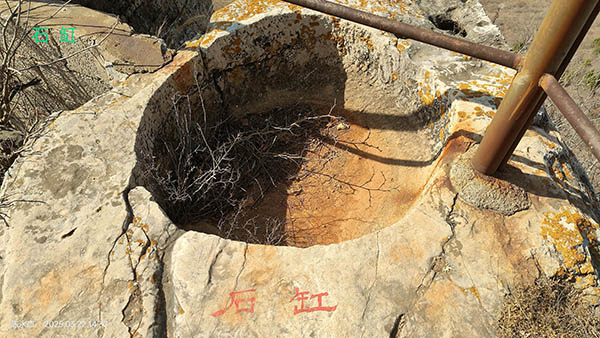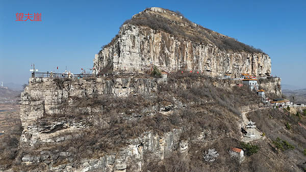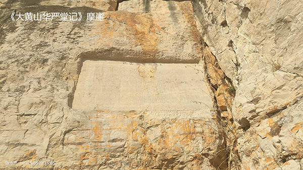 “栓马橛”西几米处岩石上凿有方形天池,长2.5米、宽1.8米、深1米,天池以西不远处有石缸、石臼,石缸长1.15米、宽1米、深0.5米,石臼直径0.4米、深0.25米。天池、石缸、石臼所在的崮台,下临深渊,今称“望夫崖”。绕过西嘴子,转到崮北侧,挂壁小径内侧悬崖底部有一凹进处,今称“面壁崖”。沿天街绕到崮东侧,小径旁有栩栩如生的人面石、落泪石、旗杆石,旗杆石类如石碾台,中有圆孔,传为明末清初农民义军领袖“九山王”王肖武驻军于此时插旗杆处。旗杆石往西不远的崮南侧的崖壁上有《大黄山华严堂记》摩崖,呈长方形,距地3.5米,长2米,高1米。未查到该题刻文字,题刻离地面太高,无法辨识文字。从摩崖处沿天街西行不远,就是大雄宝殿了,至此,已在第二层平台上沿崮绕行一周了。