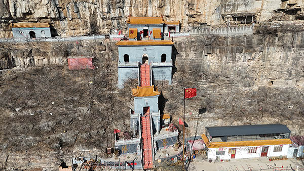 穿过刻有“太皇崮”三字的景区石牌坊,沿曲折石阶直上,最后登上陡直的红色台阶,来到山崮正南的云台寺下。云台寺斜跨第一、二层平台,因山势而建。云台寺始建时间,一说为宋景德年间(1004年—1007年),一说为明嘉靖年间(1522年—1566年),明清时期香火旺盛,后毁于战乱。2014年进行恢复性建设。