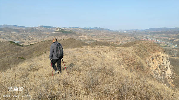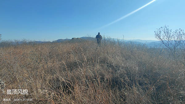 查看网络地图,往东不远就是齐长城经过的紫草岭,与九泉崮东麓根址相连。因旧产紫草,故得名“紫草岭”。为了查看齐长城遗址,权衡之下,我俩没有南去,而是沿北部山脊,一直朝紫草岭方向走去。走不多远,发现一处方形岗哨类建筑遗迹,长、宽均3米,墙厚0.6米,残高不足1米。周边覆盖着高约1米的厚密荒草,不知是因大风吹刮或是因雨水冲刷,所有荒草一律向东倒伏,像是面东朝拜的列队整齐的士兵方阵。