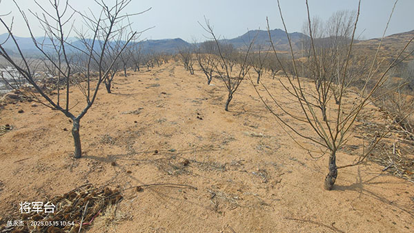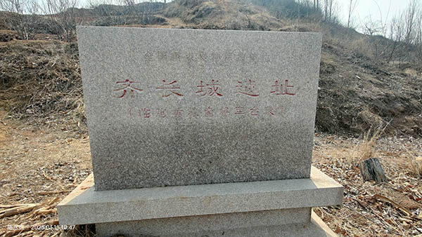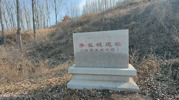 齐长城从驴皮崮进入临朐县境后,经过的主要山峰依次有聚粮崮、大崮、皇崮堆、将军胡同、九泉崮、紫草岭、高山等。聚粮崮、大崮(双雀山)都去过,具有传奇色彩的将军胡同是个什么样子呢?据资料介绍,将军胡同应在西北不远、弥河西岸的大、小东山村附近。遗憾的是这次因时间关系没有去寻访。但我当时就下定决心,一定要找机会去看看。2025年3月15日再次去临朐,终于找到了将军胡同。将军胡同又称将军台。据文保碑介绍:“该黄粮崮将军台段长城有大山东将军台(将军胡同)、将瞭台遗址,与长城防守、传递信息有关,位于小山东村南300米弥河西岸。长城南侧为将军台,面积2350平方米;长城北侧为将瞭台,面积2000平方米。”如今遗址被水泥路拦腰截断,路两侧为五六米高断面,遗址顶部种植板栗等。