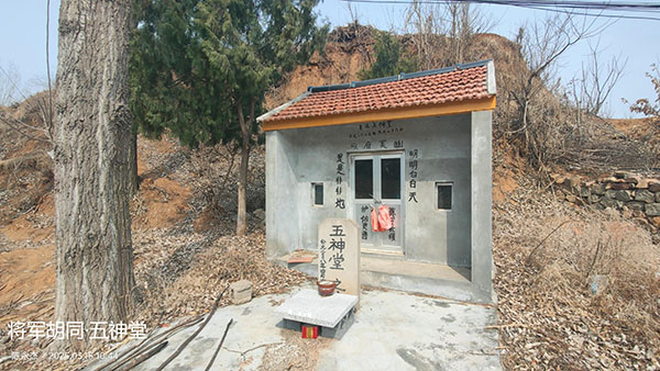 路北侧,背依断面,建有一座简陋的五神堂,里面供奉五位泥塑神主,塑法古拙,身披红布,神态各异。山西右玉五神庙主殿供奉龙王(司雨)、土地(司农业)、禾神(司谷物)、火神(司灾防)、山神(司生态)五神。昆都山五神庙依传说供奉五位义士。还有的五神庙供奉龙王、虫王、马王、青苗王、财神等五神。这里的五神堂内供奉的不知是哪五神。