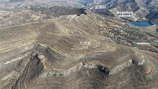 查阅地方志书,发现古今志书提到该崮的不多,如临朐最早的私修县志《昌国艅艎》卷二“山川”条提到50多座山崮的名字,《康熙临朐县志》介绍山崮56座,《嘉靖临朐县志》介绍山崮48座,《民国临朐续志》介绍山崮115座,山东人民出版社1991年版《临朐县志(1840-1987)》介绍临朐县海拔500米以上山峰84座。以上都没有“九山”或“九泉山(崮)”之名。只有《光绪临朐县乡土志》卷九记载:“其西南三十余里为九泉山。在九山集北偏西二里许,盘踞九山、文峰两社之间。上有九顶,九山社、九山庄之命名皆以此。山顶四面皆峭壁。又有九泉,四时不竭。其东麓与紫草岭根址相连。”《临朐县志(1840-1987)·九山镇村名录》(山东人民出版社,1991)记载:“九山(村)位于县城南37公里,建村年代为明代,村临九泉崮(俗称九山),故名,为九山镇政府驻地。”据此可知,因“上有九顶”,俗称“九山”;“又有九泉,四时不竭”,故称“九泉山”;因山体具备明显的崮貌特征,属岱崮地貌,故今称“九泉崮”。崮下村民因所处位置不同,又有不同的称呼,如南侧的村民称“北山”,西侧的村民称“东山”等等。