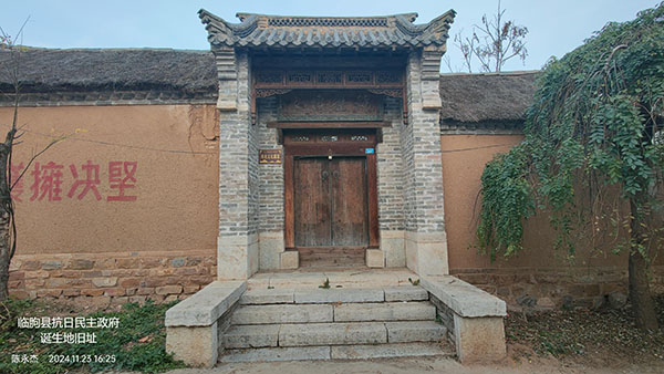 经过半个小时的艰难历程,我俩来到一处崖壁下,攀上崖顶,有两道东西向围墙,高1至3米,宽约1.5米。越过围墙,迎面而来的仍然是杂乱无章的荆棘丛,我俩只好沿着崮顶最北侧的山脊朝东行进,钻出荆棘丛,走过一段荒草、黄荆交替的斜坡,来到一个小高坡,视野顿时开阔,再往东的路就好走了。站在这处小高坡,整个崮顶一览无余。崮顶面积很大,我们处于崮顶的西北部,往南应是九泉崮的主体部分,也是崮形最美、崮貌特征最为明显的部分。所处位置正南面的响水崖村,历史悠久,村内有临朐县政府诞生地旧址。1943年9月15日,中国共产党领导的临朐县抗日民主政府、临朐县大队在九山镇响水崖村成立,诞生了临朐县第一届领导班子,县工委书记高奋兼任县长、县大队长,桑方国、谭绍华分别任县大队的政治委员、特派员。至1945年8月,中共临朐县委、县政府机关由九山迁到冶源镇宋庄,继之移往临朐。