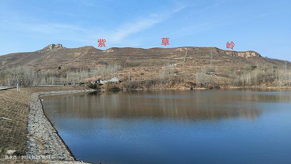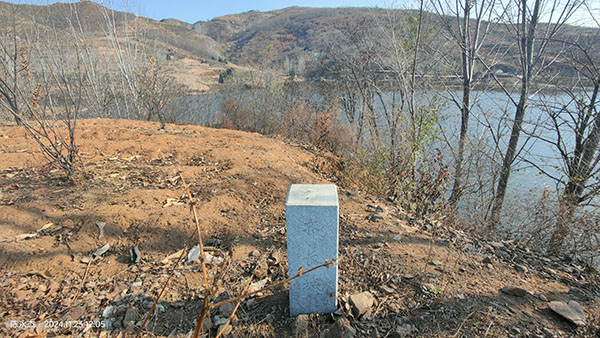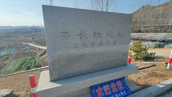 大坝西头有齐长城文保碑,上刻“齐长城遗址(临朐紫草岭段)”。齐长城从东面的山坡处延伸下来,到山坳处成了响水崖水库的堤坝。水库三面环山,南边则以长城墙体为坝,底宽约10米,紫草岭附近的村民祖祖辈辈在城墙“堤坝”上行走,城墙表面已经被磨得锃亮,墙体也被踩轧得异常坚固。在水库大坝上走了一趟,返回大坝西端,沿紫草岭东坡朝山脊攀登,一路见到多个刻有“齐长城”字样的界石,巧了,我们上山的路线正是齐长城所经之处。