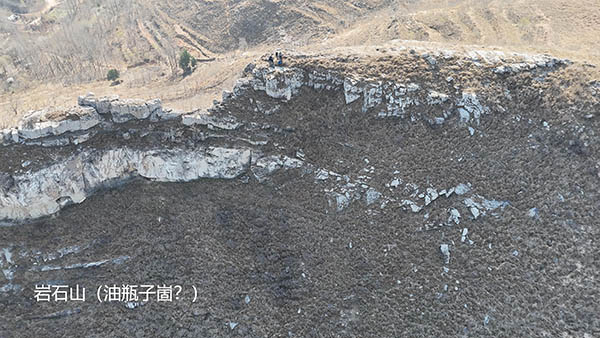九泉崮和紫草岭之间的山脊最高处,有一处陡峭的岩石山,这是整个九泉崮和紫草岭顶部,唯一一处岩石山头,也是整个崮顶最美的风景。其中一段两侧陡崖,顶面平坦,部分岩体崩裂,摇摇欲坠。整体来看,这处石头山具备部分崮貌特征,可以看作是一座小崮。我俩从岩石山南侧的小路下山,一直下到响水崖东沟水库大坝处。站在大坝上,回首西望,只见我俩刚才攀登的岩石山,酷似趴在岭脊的一个大蜥蜴,头东尾西。泰安五老人路宗元等著《齐长城》一书中多次提到“油瓶子崮”一名,据书中所附“临朐县齐长城调查表”,齐长城弥河西岸至油瓶子崮东坡段,东西长约2250米,所经主要山峰有油瓶子崮,所经村庄左侧有石柜子、小尧峪两村,右侧有杨家峪村。由此猜测,路宗元等提到的“油瓶子崮”,要么是上面的形似蜥蜴头的岩石山,要么就是九泉崮。