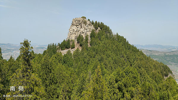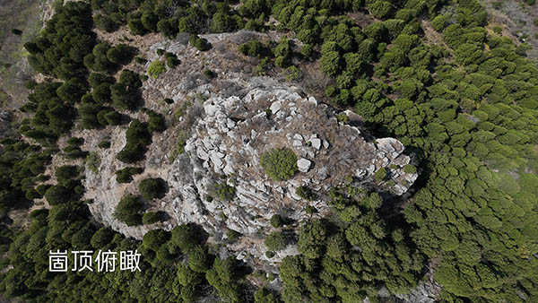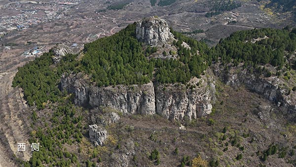 因从康王顶至和尚帽,一路是在山脊行走,直到身处崮顶,也没有感受到攀登的艰难。站在崮顶,取出无人机,通过无人机看到的和尚帽全貌,才发现已是身处巨大崮台之上的一个圆形小崮的崮顶。整个山体东、西、北三面悬崖,悬崖上部平缓,植被茂盛,中部又凸起一峰,也就是我目前脚下的小平台,平台四周岩石裸露,崖壁陡峭,岩石风化,难以攀登。苏轼诗“不识庐山真面目,只缘身在此山中”所描述的感受,在攀登和尚帽的过程中也能体验到。