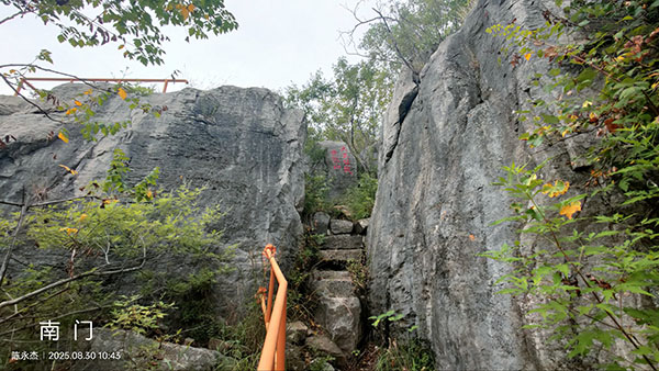 我2011年从北门、2020年从南门、2025年从西门先后三次登顶瑞云崮。记得2011年3月20日那次,我是从跋山水库大坝方向过来的,为走捷径,选择从难度最大的崮北端人称“鸡顶子”的地方攀登,自一条悬崖缝隙中,四肢并用,手攀脚蹬,再施以“轻功”手段,终于战战兢兢、气喘吁吁成功爬上崮顶。浏览完崮顶后,自南端的南门下崮,南门高近4米,宽仅半米许,两块耸立的天然石壁之间有人工雕凿的石梯,几乎直上直下,石门两侧岩石上凿有门闩窝。沂蒙诸崮中,我首次攀登的就是瑞云崮。还是38年前上初中时的一个清明节,几个学伴相约骑车到跋山烈士陵园扫墓,之后去攀登瑞云崮。当时崮顶什么样子已无印象,只记得从最陡峭的崮北侧奋力登上崮顶时,听见已登顶的大人赞叹说:“小孩子挺厉害的,也能爬上来!”当时听了感到很自豪!