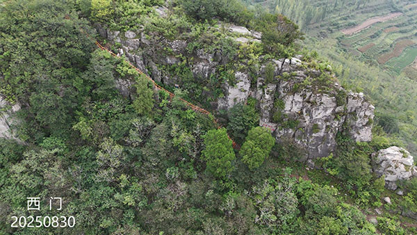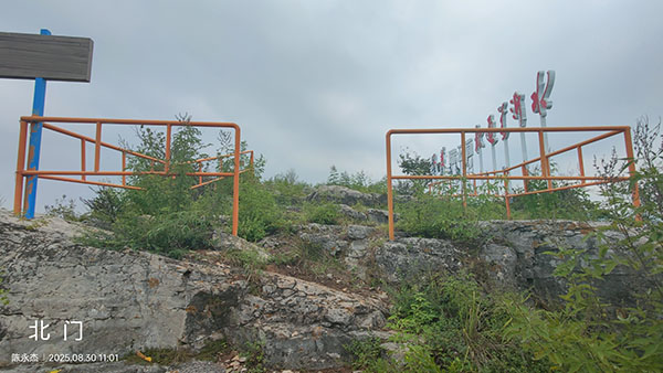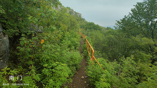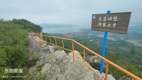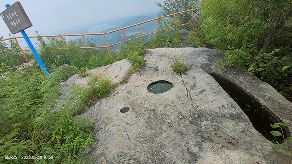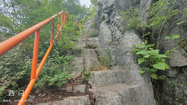 2025年8月30日,我第三次攀登瑞云崮。这次也是从跋山水库大坝过来,经河奎村西,将车停在营盘村东南方向的瑞云亭下,这里有西山门入口提示牌,自此沿路上山,走过一段薄石板路,就是高大茂密的栗子树、核桃树及其他杂木组成的林灌丛底的原始山道。昨天刚下过雨,今天天气预报仍有雨,这时雨还未下,路面湿滑,空气潮湿,头顶喜鹊在“喳喳”叫,有孩子的声音传来,走在这将雨未雨的山间林底,一路感到野趣十足。攀至崖底,沿着设有黄色护栏的台阶轻松登顶。崮顶除了设置必要的安全防护栏、景点提示牌、温馨提示牌外,基本保持了原始风貌。