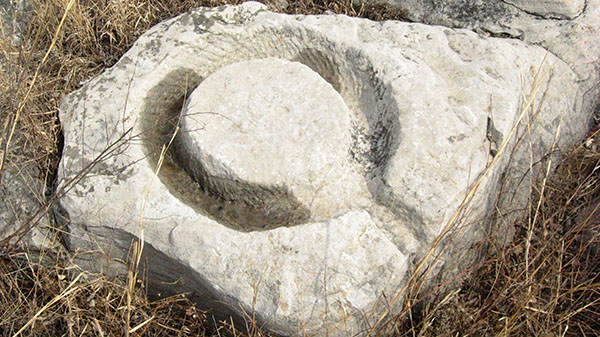 沂蒙山区的崮顶多有山寨文化遗迹,瑞云崮也不例外。崮顶山寨的防御设施主要由寨墙、寨门、岗堡组成,如今寨墙遗迹已荡然无存。沂蒙崮的寨门主要有三种形式,一是以天险为门,二是为城堡式石砌石拱门,三是采用长方形石砌门。这两处的石梯应属第一种,主要以自然天险为门,兼具寨门、关口的功能,这个门户关闭之后,外人是很难攻破的。在崮顶西部偏北处,排列着间间相连的石屋的残垣断壁,大多被荆棘、拉拉秧等杂草丛覆盖,这应属“岗堡”遗迹。崮顶南部的几块岩石上,有多处人工开凿的石臼、食槽、石磨盘等痕迹,还有几个圆形石坑,估计是竖立旗杆的石窝,证明崮顶不仅有人住过,还曾经在此屯过兵。崮顶山寨既是世代乡人的避难之所,也是兵家必争的军事天险。