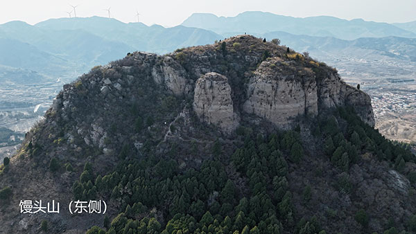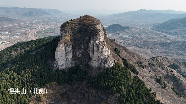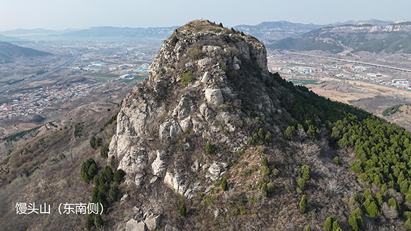 站在崮顶俯瞰,东有京沪铁路、京沪高铁、104国道和北大沙河南北向经过,西有京台高速南北向经过。西面的村子是杜家庄村,西南坐落在馒头山和青龙山之间的是刘家沟村。环顾远处,只见四周群崮连绵,馒头山南依灵岩山,东临莲台山,西靠五峰山,东北不远,通明山下的千年古刹义净寺隐约可见。四周的群山大多具备崮貌特征,在我的眼中,他们实际上就是一座座崮,特别是馒头山,就是一座标准的崮,虽然官方称呼是“馒头山”,我认为称呼“馒头崮”更为确切,所以本文我用的题目是《地质名崮馒头山》。