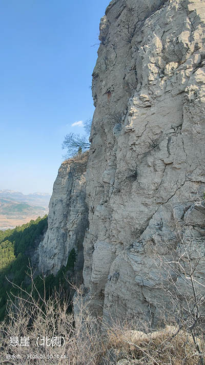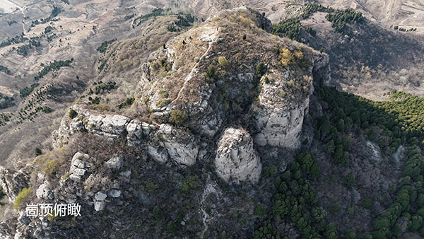 接近西北侧崖底,陡坡上密生松柏,到达崖底,石缝间有人为攀登迹象,奋力上攀,到尽头,发现是崮西北侧的一个平台,再往上是绝壁,原来是条死路!平台岩石表面也有十几个直径二三厘米的取样钻孔。原路退回至崖底,沿崮西侧挂壁小路绕到南侧,有几块岩体断裂滚落的巨石,大者如屋,形成地质灾害景观。经过落石,绕到东南侧,沿一处险径费力登顶。
