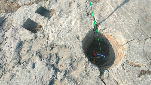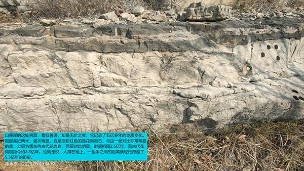 馒头山整个山体为石质山,钻出林灌不远,在山腰处见到一处裙带状岩层,上面有十几个人工取样的小钻孔。这处岩层看似普通,却是无价之宝,它记录了五亿多年的地质变化。岩层高近两米,层次明显,底层淡粉红色的是花岗岩石,上层青灰色的是古代花岗岩,两层之间时间相隔2.5亿年,而古代花岗岩距今约2.8亿年,也就是说,人蹲在地上,一抬手之间的距离,就轻松跨越了整整5.3亿年的历史!