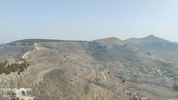 马头崮崖壁垂直高度约10米,有一个东西横亘、不规则的巨大崮台,崮台东部是高高昂起的马头状主峰。盘山路虽又弯又陡,但走到路的最高点就来到了崮台之上,再登主峰,就很容易了。