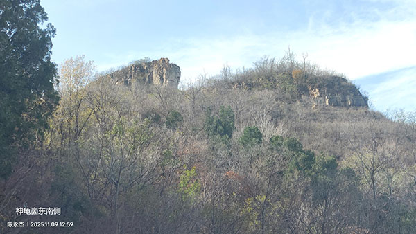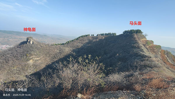 马头崮主峰与神龟崮连麓的鞍部有一道石墙,宽1—1.5米,残高不足1米。走这段路时一直穿行在林灌丛中,讨厌的黄荆种子落在身上,鬼针扎在裤子上,还有一触即扑簌簌飘落的枯叶,深秋的野外,这些是多么的令人讨厌,所以儿子边走边抱怨:“讨厌!烦人!”好在山腰的地面和粉砂岩层中,分布着大大小小、形态各异的石头,儿子从小就喜欢小石头,我不得不多次停身,等着蹲在地上捡石头的儿子,等他举着石块向我展示,我还不得不附和赞叹:“嗯,这块漂亮!”在神龟崮下,他捡到一小块圆石,上面有突起,酷似火山口,他高兴地称为“火山石”,一直攥在手里,直到回家。