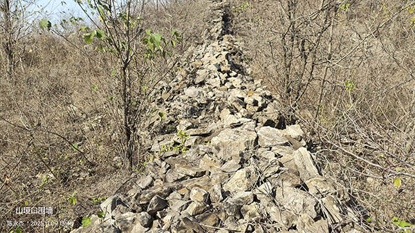 越过石墙,攀上岩石,来到神龟崮顶部。神龟崮由石灰岩、砂页岩等构成,海拔约550米,崖壁高度约20米,是一座小崮,顶部的“圆形甲壳”面积不大,有四五间石屋遗迹,遮掩在杂乱无章的林灌丛中,特别是一人多高的野酸枣枝条,张牙舞爪,面目狰狞,行走十分困难。扎在手掌中的棘刺,三四天后才剔出。东侧设山门,残高约3米,宽1米余。在这么小的崮顶建筑山寨,容纳不了多少人,不知是避乱躲匪还是有其他用途。
