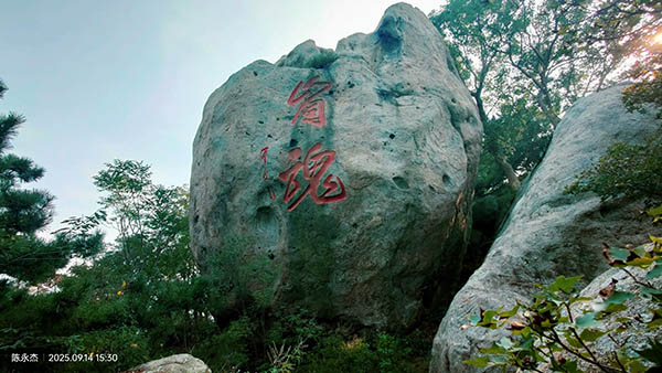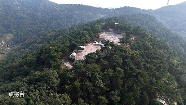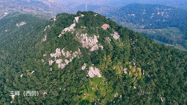 穿过一片茂密的松林,走上一段石阶,就来到了立有巨大铁架的孟良崮顶。巨石之上,立有“孟良崮主峰”石碑。这里东、西、北三面悬崖,如斧劈剑削,甚是险要。山顶林莽茂密,怪石嶙峋,属易守难攻之地,这也是当年孟良、焦赞选择这座险峰安营扎寨的原因吧。