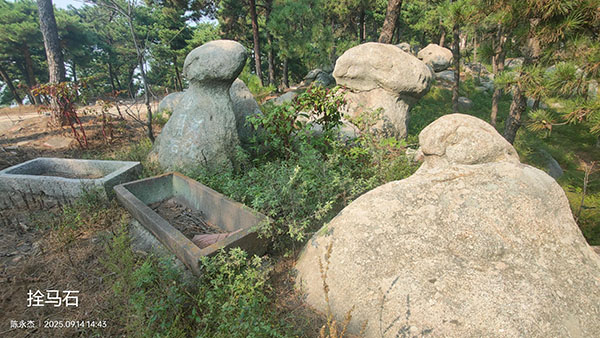 再北行100余米,就是传说孟良遛马的“跑马梁”了,路东侧有一饮马槽,还有数十个形似拴马桩的岩石,传说这就是孟良用来拴马的“拴马石”。继续前行,经过点将台,走过一木板桥,是废弃的孟良营寨。小时候听评书《杨家将》时就知道“焦不离孟,孟不离焦”,有孟良的地方就有焦赞。关于“孟良崮”一名的来历,当地流传最广的一个版本是,传说北宋名将孟良、焦赞带领人马路过蒙阴,来到山下,孟良在崮上安营,焦赞在山下扎寨,因而得名。至今山顶尚有孟良军营的碗口粗、30厘米深的旗杆窝,连接孟良崮和大崮顶的平缓山梁叫跑马梁;崮顶端有个用巨石砌起来的洞叫马棚;大顶之阴处叫刑场,是孟良、焦赞军营的法场;大崮顶前脚下1.5公里处有一片废墟古遗址,传说就是当年焦赞的营盘。