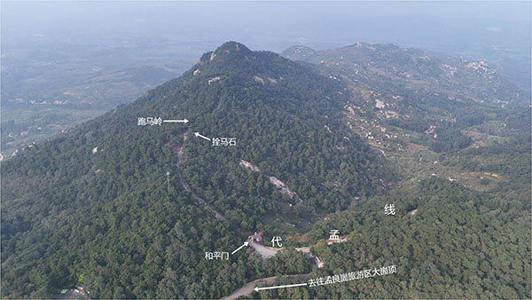 代孟线西北端尽头就是孟良崮主峰。沿书堂村南代孟线西北方向,行至孟良崮主峰南500米处,有和平门、孟良崮战役遗址文保碑及孟良崮主峰景区标识牌,