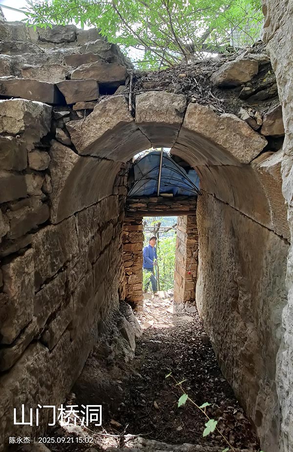 在丛林中闷头走了一阵,终于摸近了南面的山门。这座山门是上下崮顶的唯一通道,为安全起见,山门下搭起了一道长长的廊架,穿过廊架,有一扇简易铁丝门,好在铁丝门没有上锁,通过铁丝门经桥洞,再攀数级人工凿成的台阶,即达崮顶。桥洞一侧为崖壁,一侧由条石砌成,宽近1米,1人多高,长三四米,拱形券顶由五排十几块条石砌成。据说山门本来是一道完整的石门,1943年日军攻击驻守章子崮的国民革命军时,日军的炮弹将山门炸去了三分之一,后来人们用石块依原貌垒建,才成为今天见到的样子。