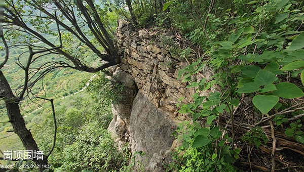 从山门翻上崮顶,即见岗堡遗迹。崮顶中部略有凸起,凸顶边沿是二三米高的牙状岩石,最顶部有五六间房屋遗迹,凸顶四周至崮沿,一圈宽四五米的平坦地带,长满树灌丛,特别是北侧,茂密的藤蔓杂缠,几乎寸步难行。凸顶南侧也有五六间房屋遗迹。崮顶四周围墙残高1~2米,隐约可见掩体遗迹。崮顶的围墙、房屋及掩体遗迹,原为古寨遗址,后为近代战争遗存。