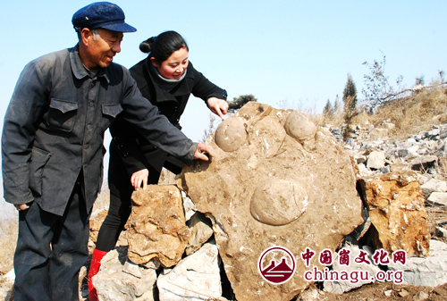这块重达200公斤的石灰岩上有三个凸出的圆形,呈倒三角形分布,上方的两个准圆,有碗口大小,质地坚硬,酷似蛋类化石嵌入岩石中,组成一双巨大的眼睛,炯炯有神。而下面的椭圆形就像一张大嘴,与“天眼”相呼应,整体造型宛若金蟾一尊。(丁军国 摄)