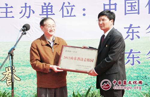 四月的校园,花团锦簇,彩带飘扬,人声如潮。14日上午,在蒙阴一中2012春天送你一首诗”大型诗歌朗诵会上,中国作家协会《诗刊》杂志社编辑部主任朱先树先生代表《诗刊》社和山东省高级中学协会为学校颁发了“山东省诗意校园”荣誉称号。(丁军国 摄)