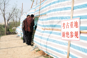 围挡上有个破洞,很多游客从这里向内张望,武警战士晃晃肩上的枪,游客们连忙纷纷后退,然后又笑着围上来,尽管只能看到一个罩在古墓上方的防雨罩子,老百姓还是凑着热闹:“还不让看咧,啥时候才让进啊?”