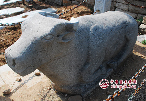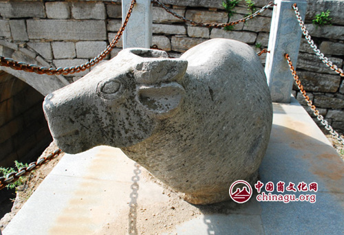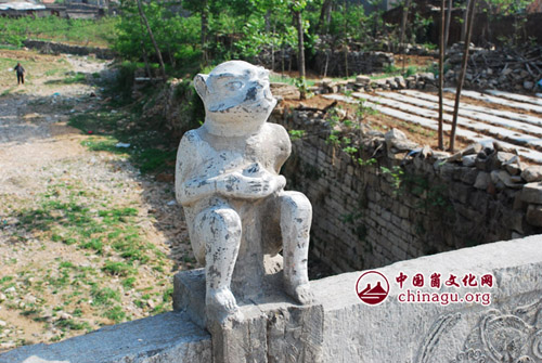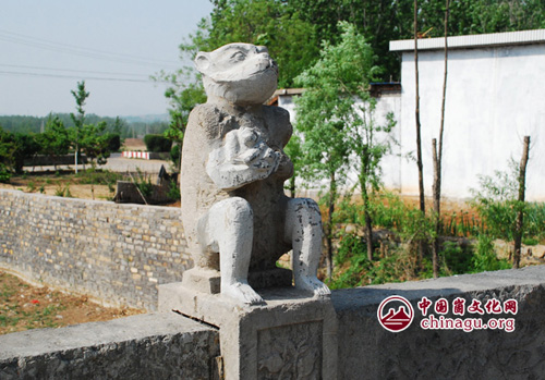 上游距桥1.35米处两岸各有一石牛,东雄西雌,石牛身长1.72米,通高0.60米,头部略残,盘卧,身躯肥壮,颈部粗短,眼外鼓,下游距桥2米处两岸各有一石狮,整体高0.83米,底宽.045米,石狮蹲坐在石座之上,头略侧歪,胸前佩带铃铛。石牛石狮雕工精美,形象生动。