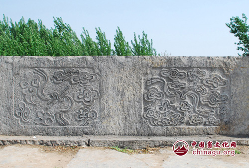 桥北册由东向西第一块栏板画面为两幅。右幅正中刻玉版,四周饰祥云纹:左幅中部刻一把宝剑,周围饰祥云纹。他们分别意喻曹国舅和吕洞宾。