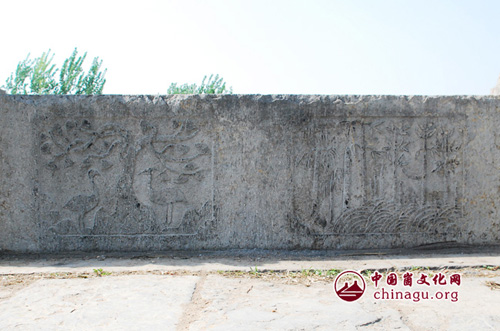 桥南侧由东向西第一块栏板画面为两幅。左幅,画面中部刻一花团锦簇的大花篮,四周饰祥云纹;右幅,画面中部刻茎叶弯曲,清丽高洁的荷花,四周饰祥云纹。两画分别意喻民间传说的“八仙”中的蓝采和,何仙姑。第2块栏板画面为两幅。左幅,中部刻一棵盛开的菊花,茎叶稀疏,委婉多姿:右幅中部刻一棵牡丹花,端庄秀美,花下伫立一只长尾鸟,另一只在花间飞翔。